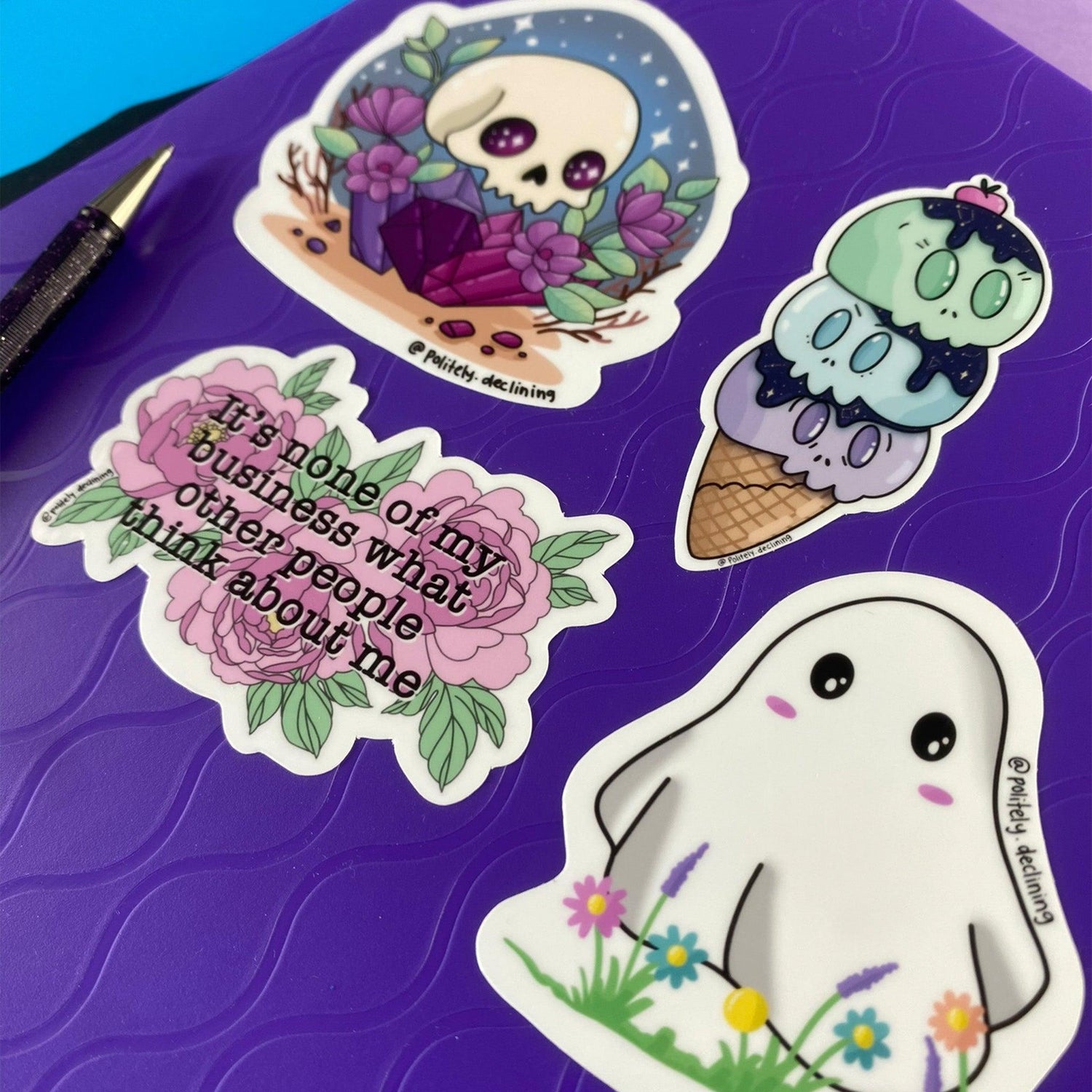 Our handmade stickers feature hand drawn original designs by Politely Declining. Whether you...